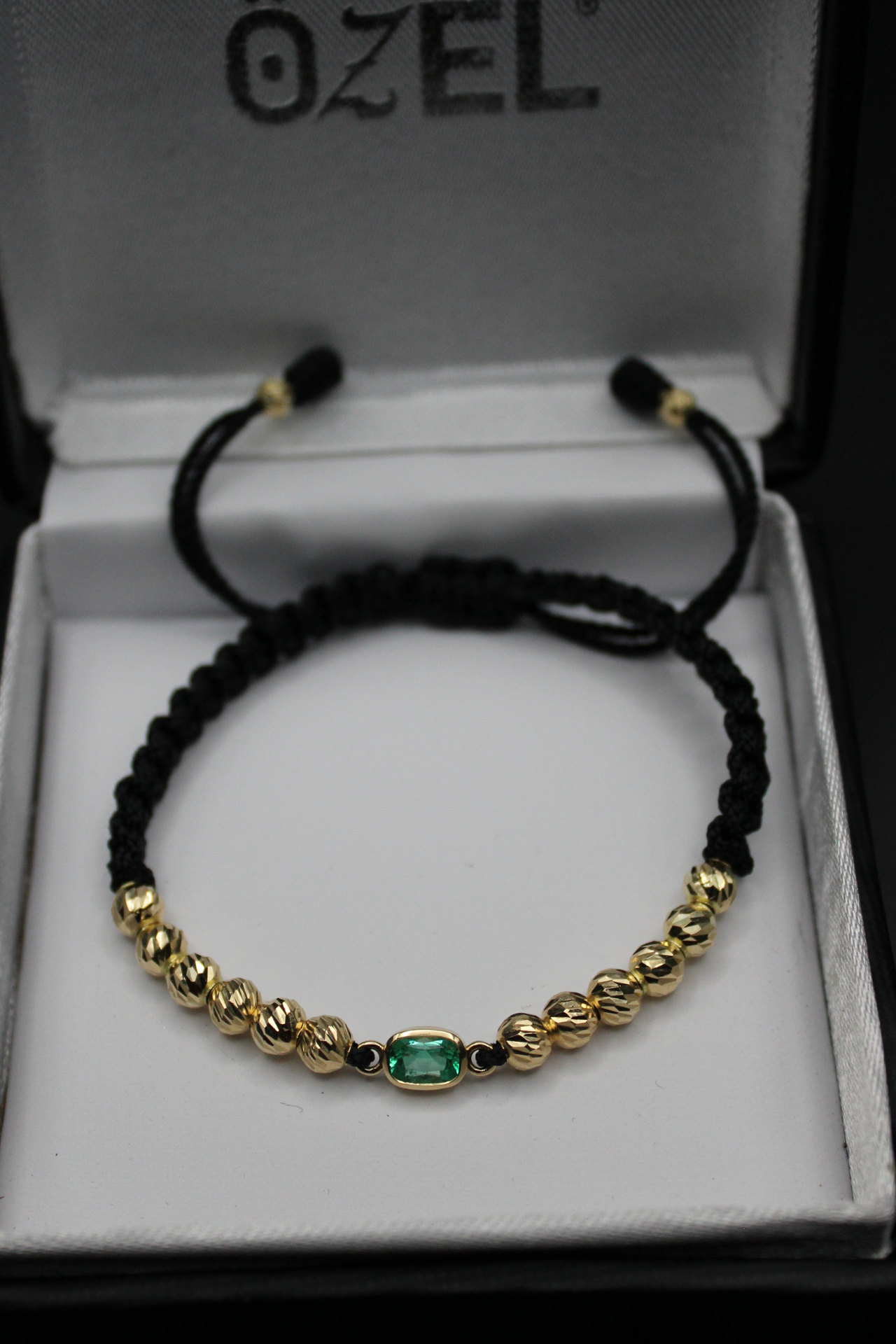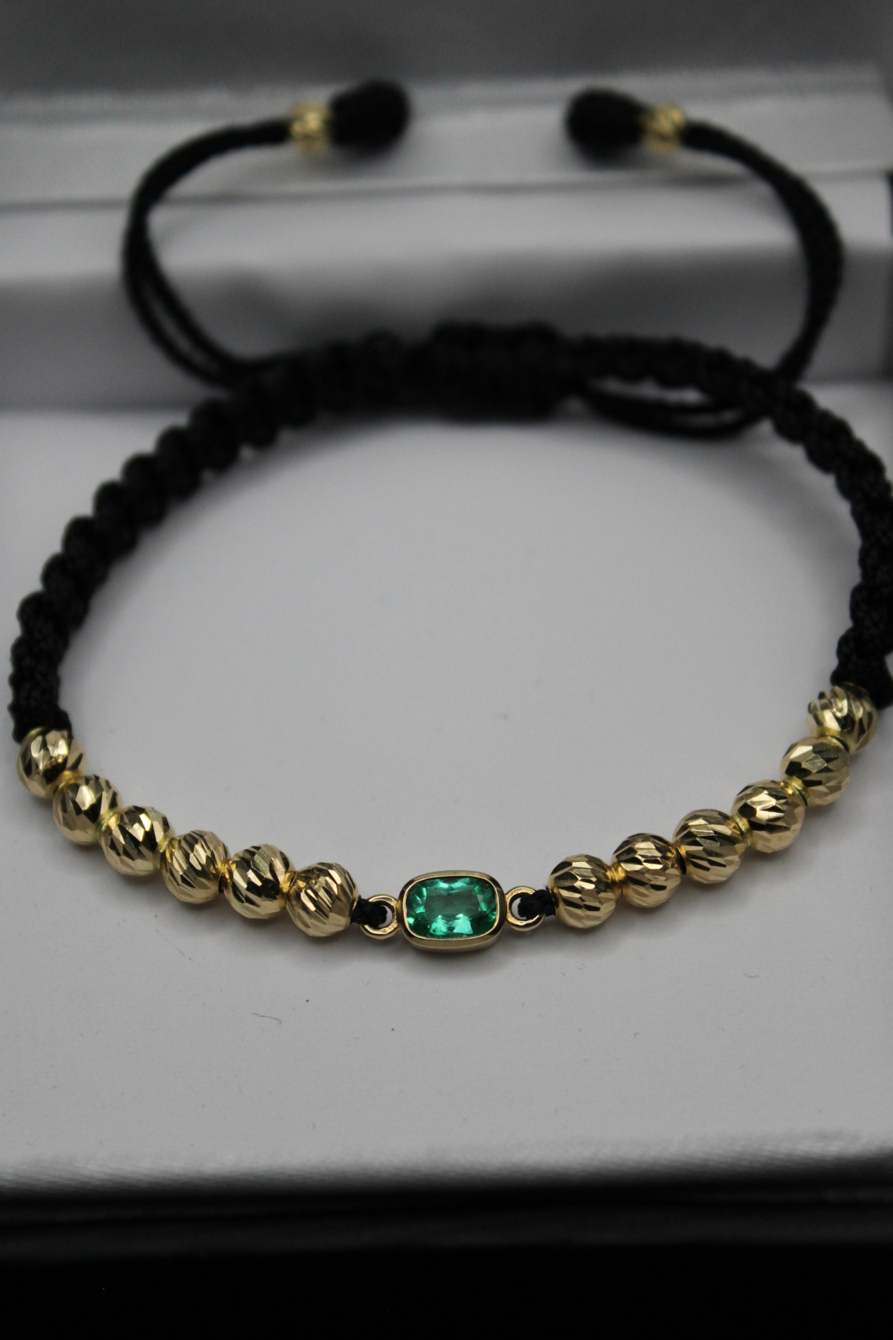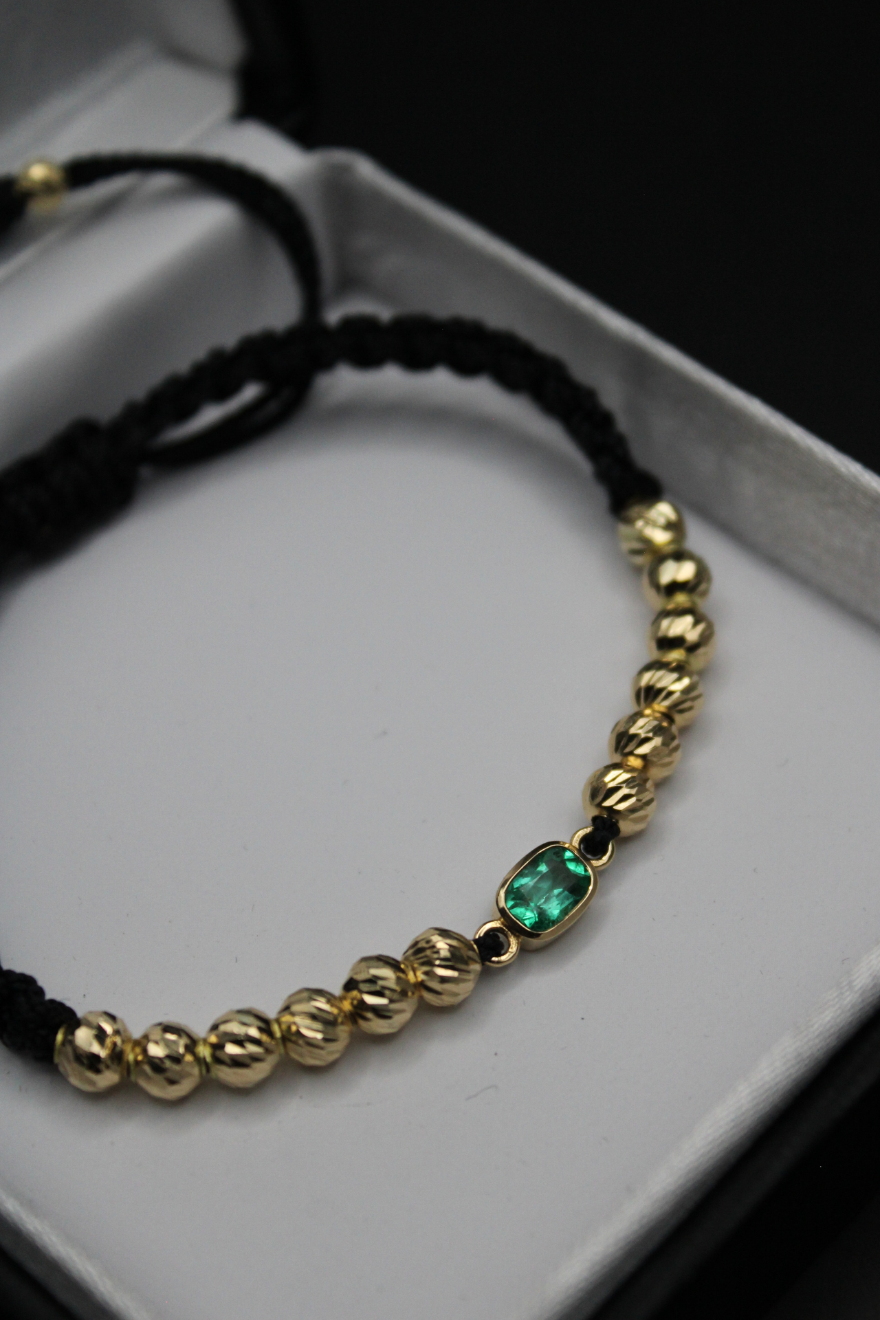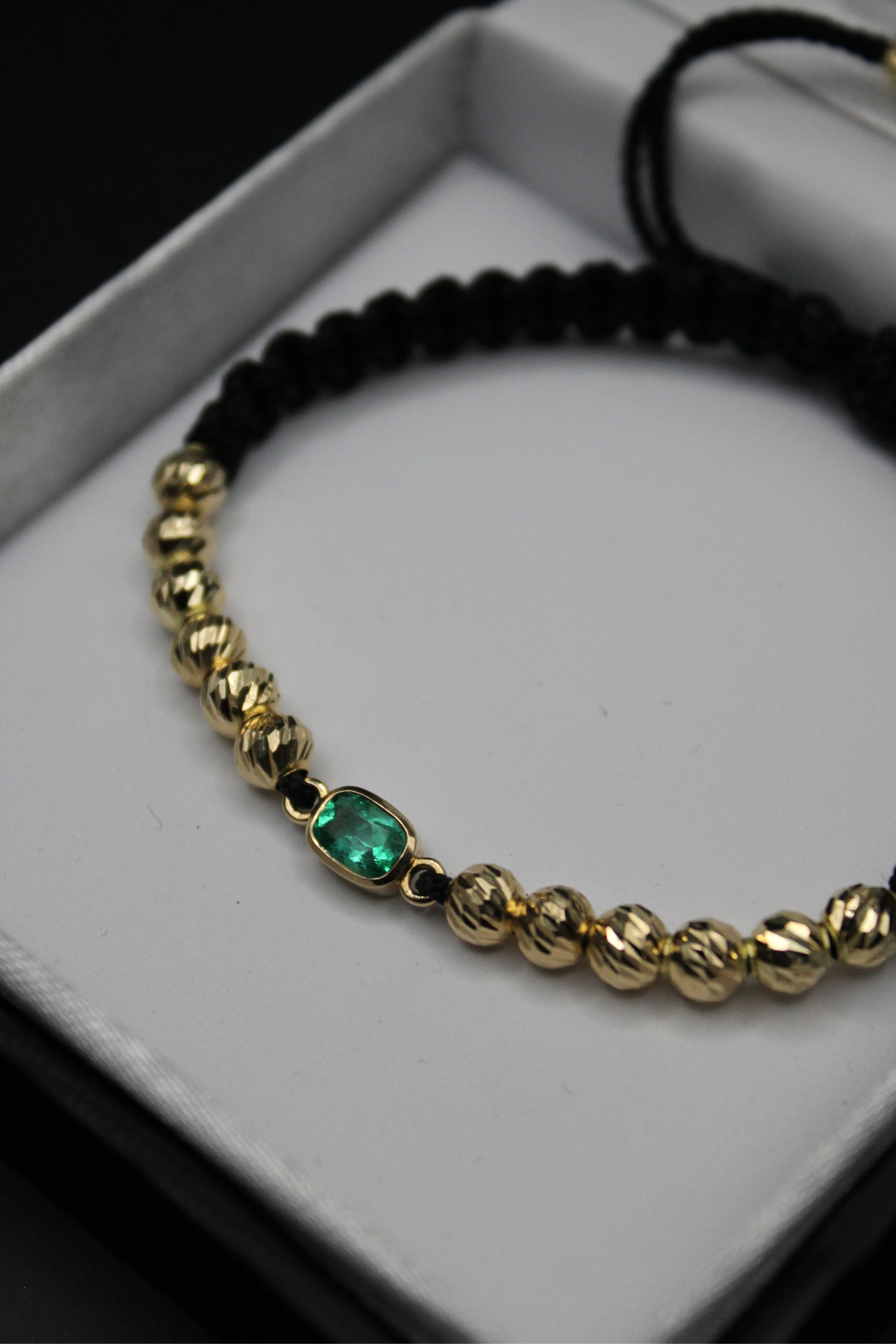 Una joya pensada para quienes valoran la elegancia en los detalles. Esta manilla combina finos balines de oro 18k con una esmeralda colombiana central que resalta por su intensidad y carácter. El contraste con el cordón negro ajustable ofrece un equilibrio entre sofisticación y estilo contemporáneo, ideal para llevar a diario o en ocasiones especiales.