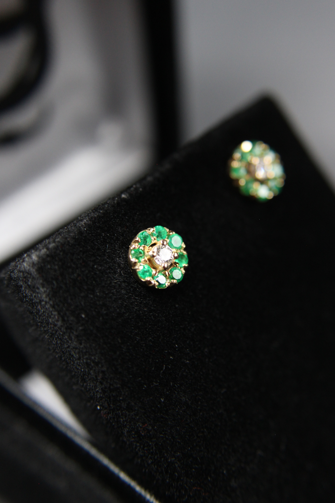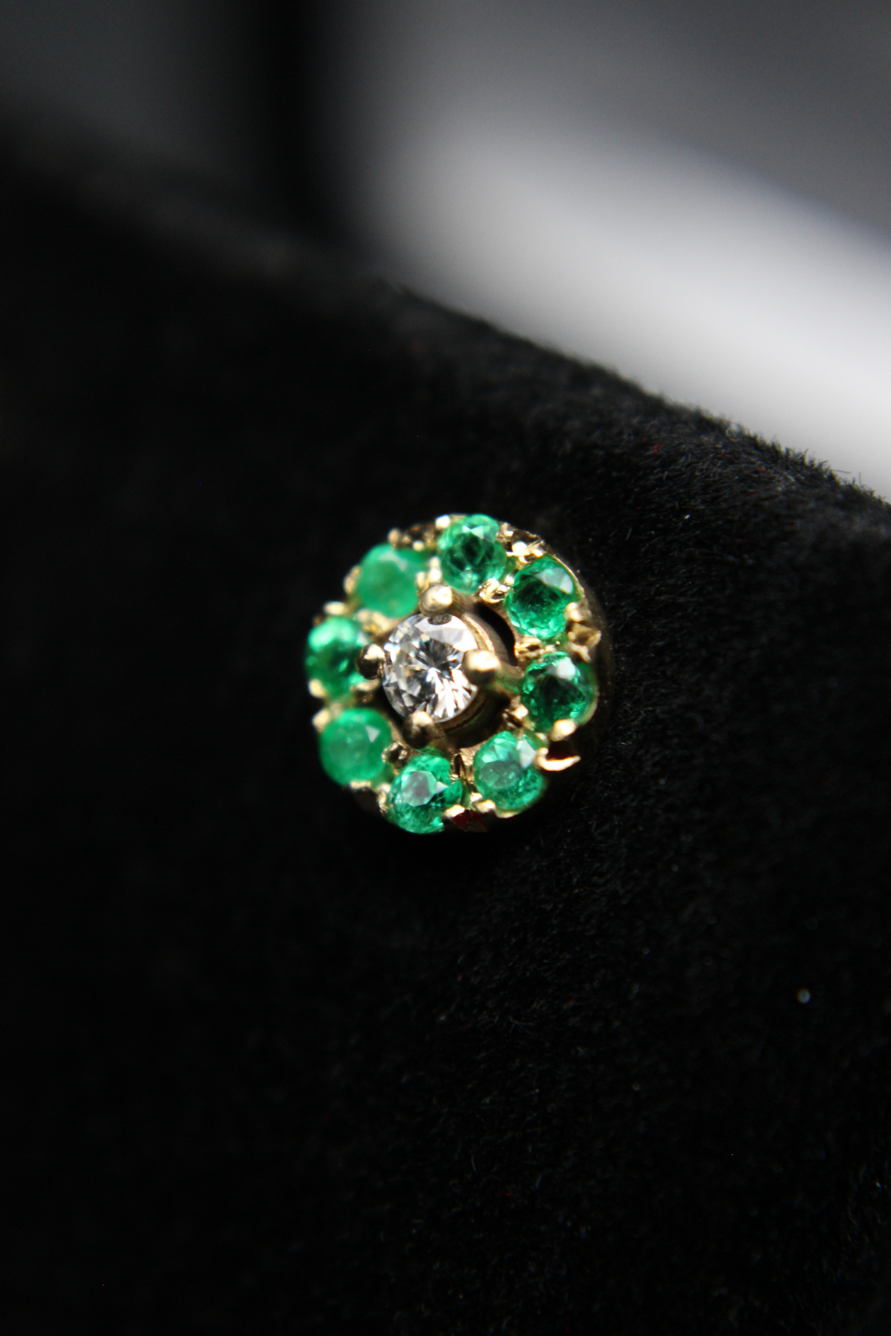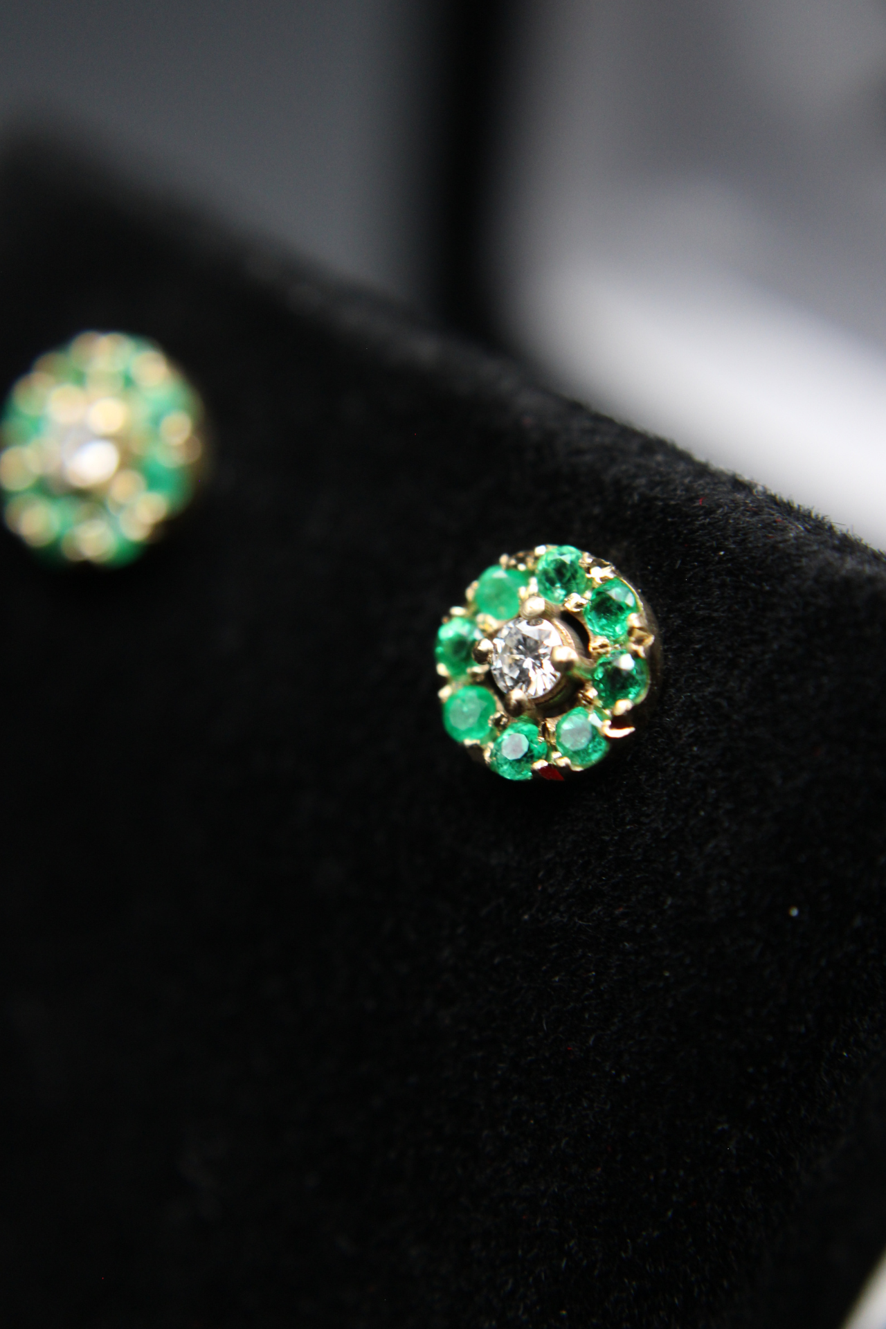 Una joya que celebra la pureza y el equilibrio. Estos topos, elaborados en oro con un diamante central rodeado de Esmeraldas naturales, evocan la perfección de la naturaleza en su forma más esencial. Su diseño redondo, delicado y atemporal, simboliza la armonía interior y la belleza auténtica. Perfectos para quienes desean llevar consigo un toque de lujo sutil, lleno de luz y significado.